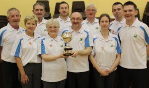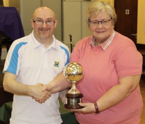 Keith Middleton (Crosshaven) receiving the Frances Cody Trophy from Margaret Holly, Chairperson Wilton Bowls Club